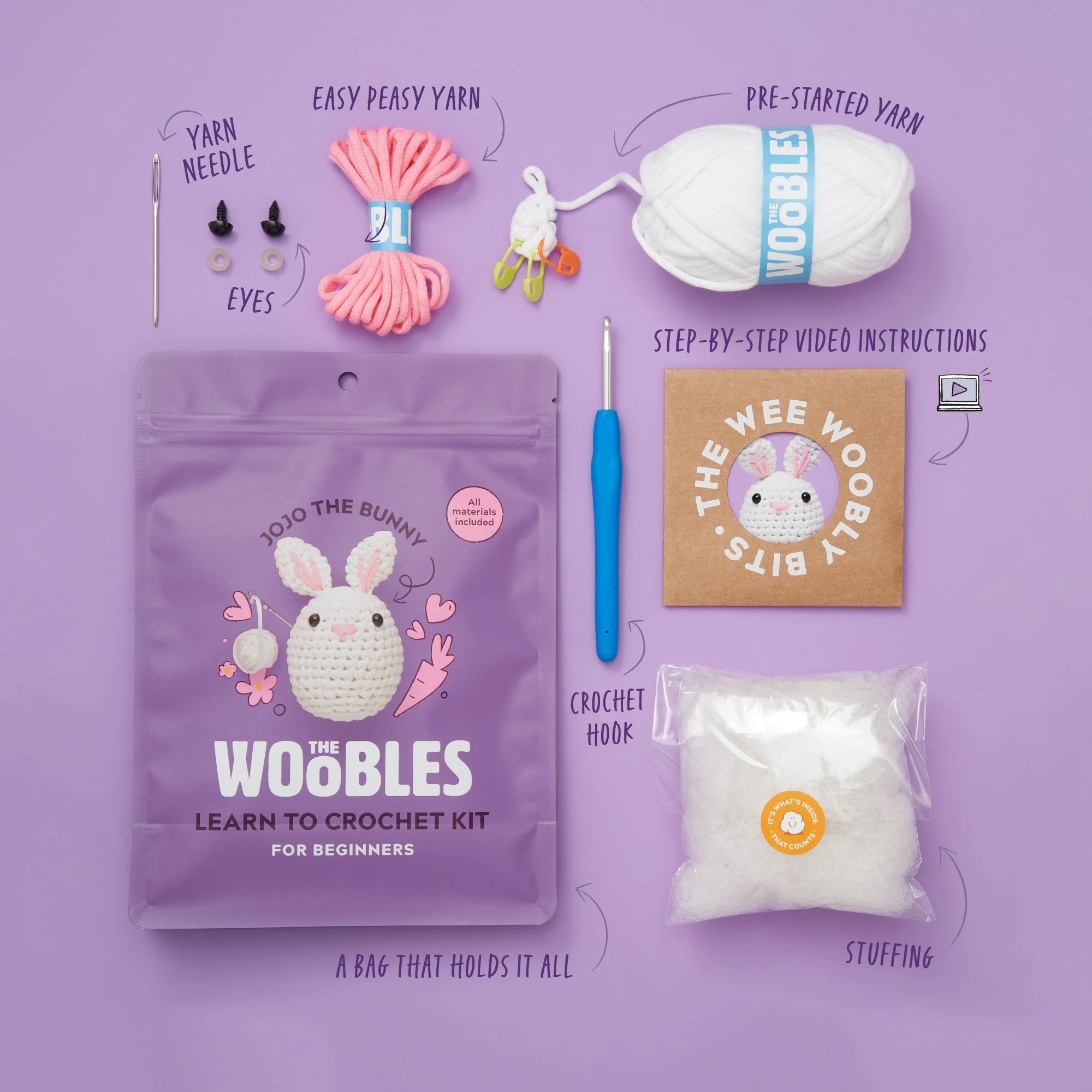 With The Woobles Easy Peasy Yarn™ and step-by-step videos, this bundle’ll be a piece of (carrot) cake, and soon everybunny will be chicken out all your wuv-able new Woobles and their egg-cellent Easter swag. So let’s hop to it and bring this basketful of Eastery cuteness to life!